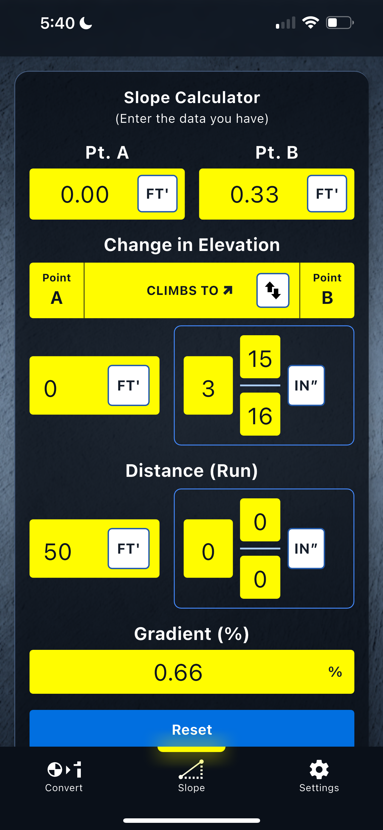 The built-in Slope Calculator quickly determines elevation differences, distance, gradient, pitch, and grade—complete with rise/fall toggles and instant unit conversion (Decimal Feet, Feet & Inches, or Meters).